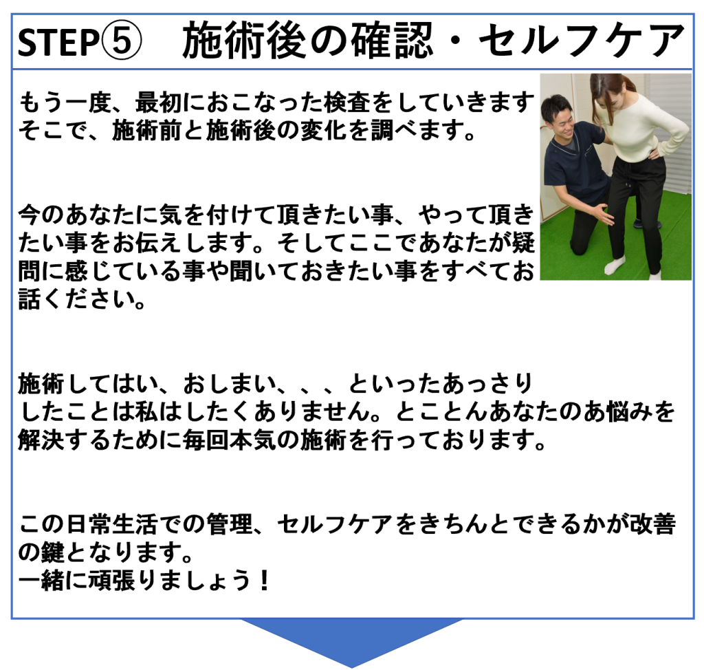 施術後、生活をしていると何か不安なことが色々と見つかるものですよね。そんな時でも安心してください。痛みの原因がわかれば患者様自身である程度ケアをすることができます!